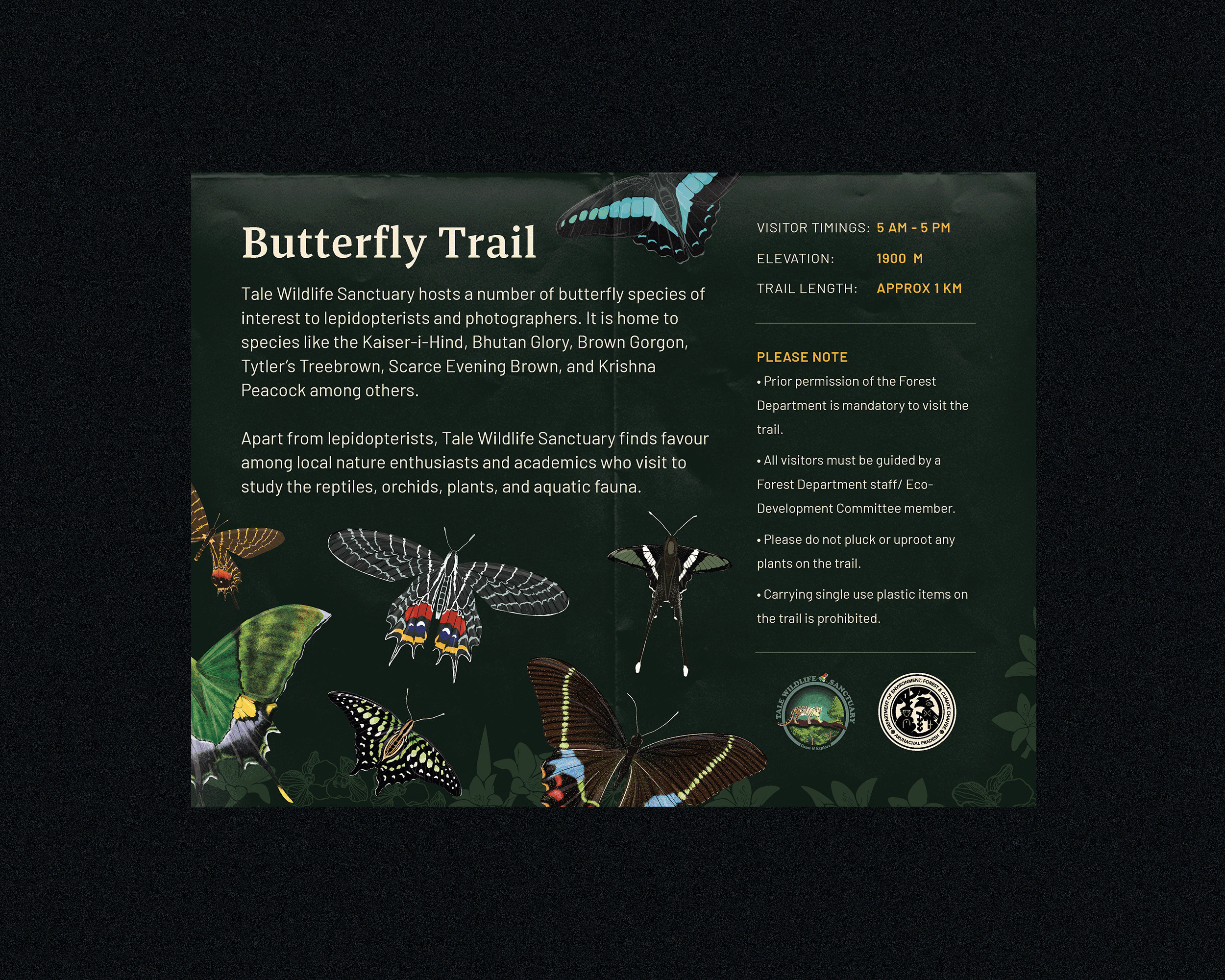 Designed and illustrated signboards and a trail map for Talle Valley Wildlife Sanctuary, a protected area in Arunachal Pradesh, India.